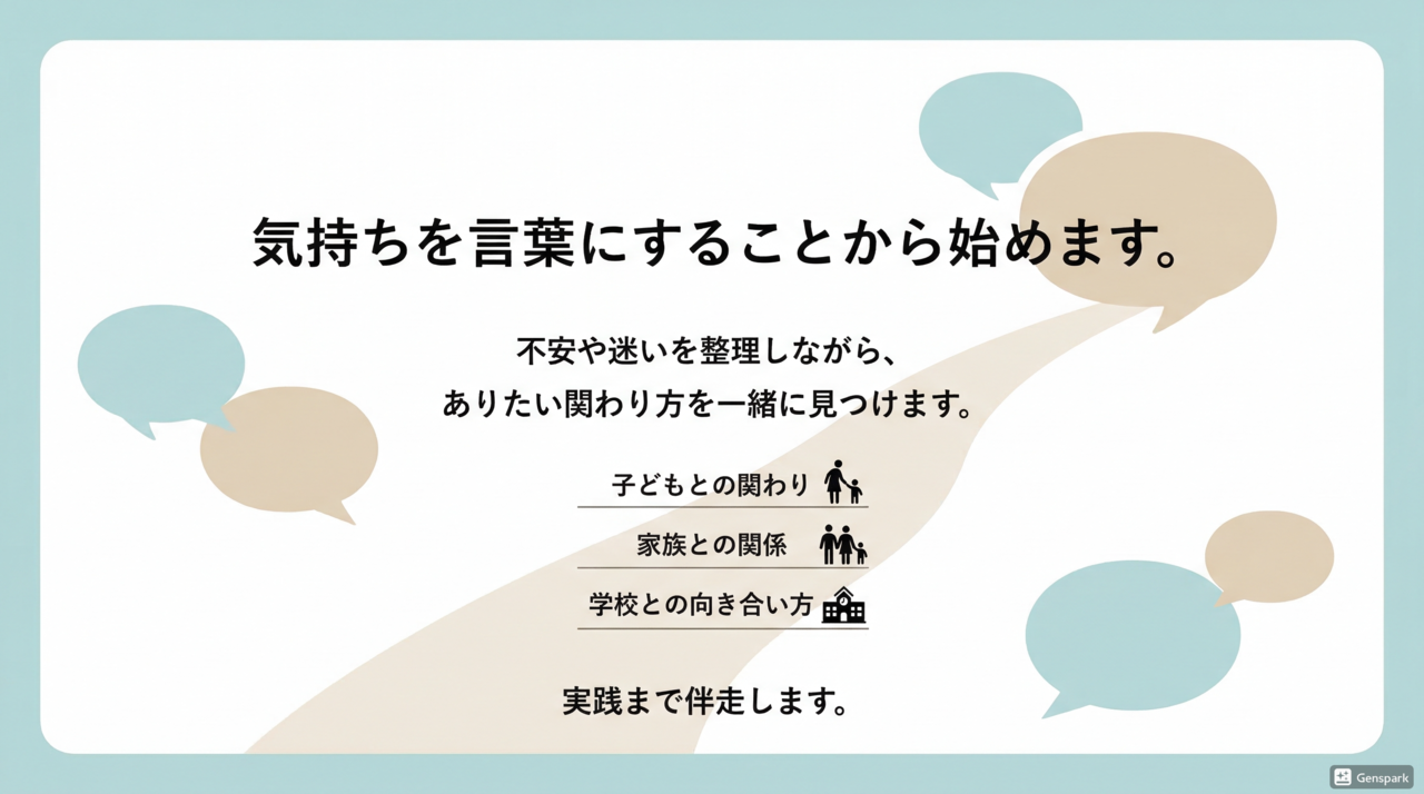 考えて終わりではなく、実際の関わりの中で“できる変化”まで一緒に進みます。