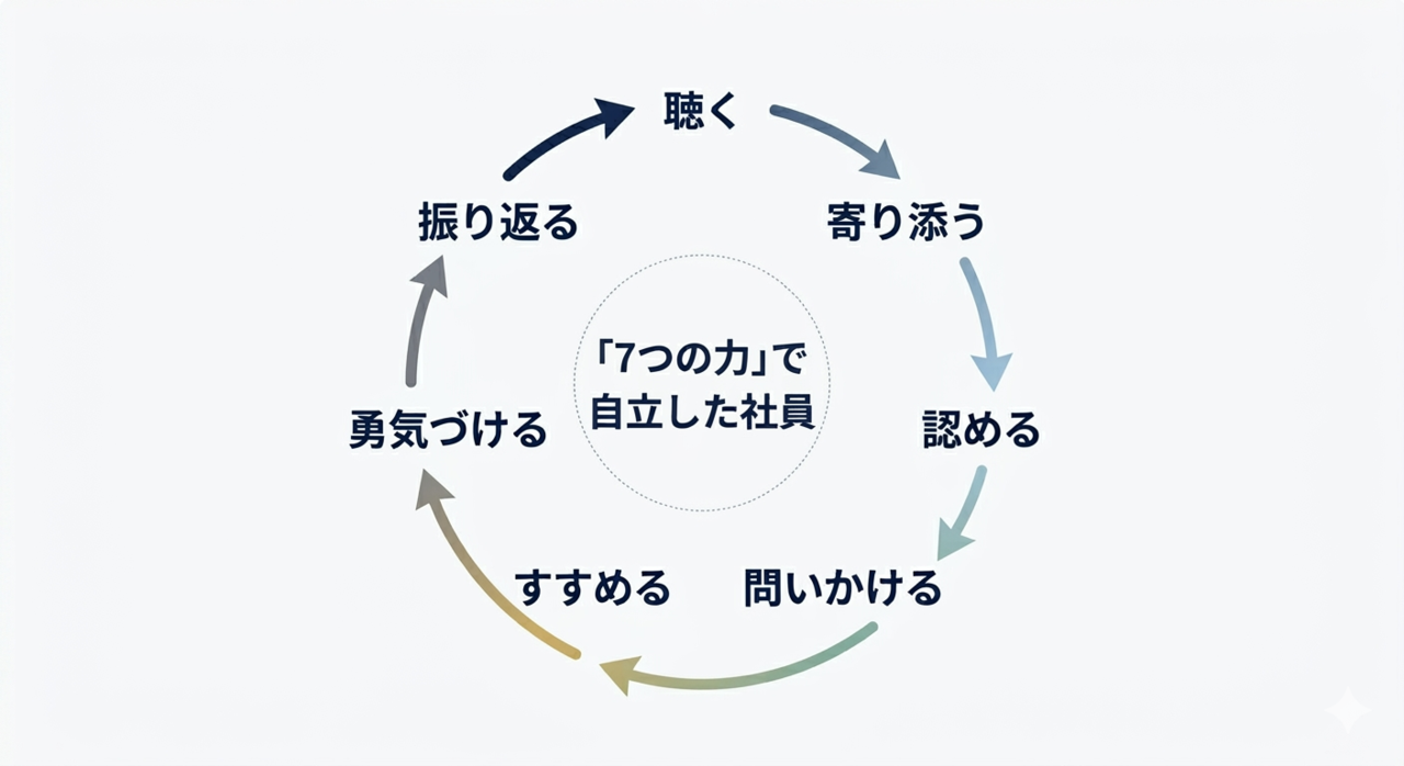 「聴く・寄り添う・認める・問いかける・すすめる・勇気づける・振り返る」この7つの力を軸に、相手の主体性を引き出す対話力を身につけていきます。